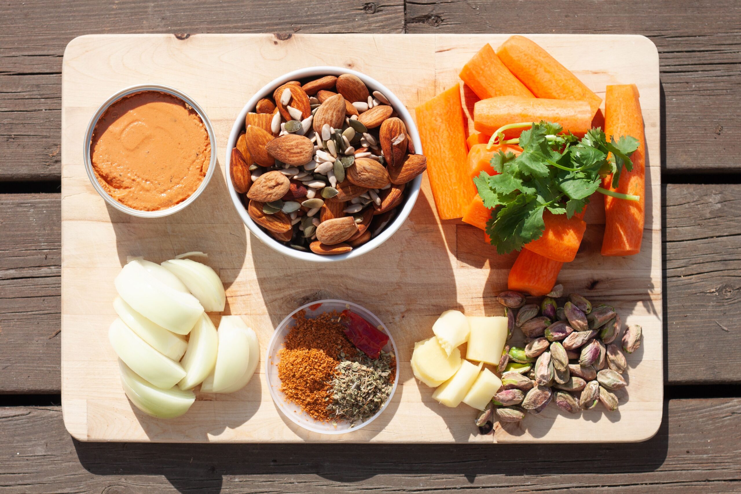 1. Nøtteblandingen bløtlegges over natta, la drypptørke før bruk, ellers blir de «melne» når de hakkes.