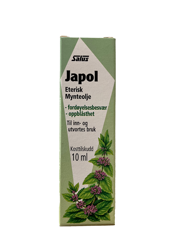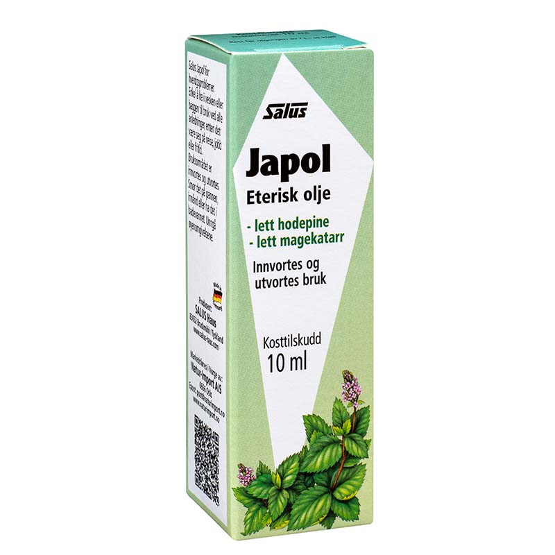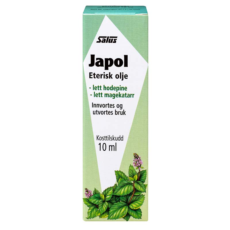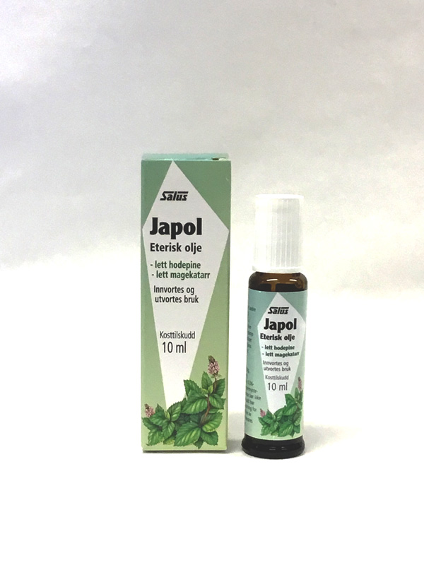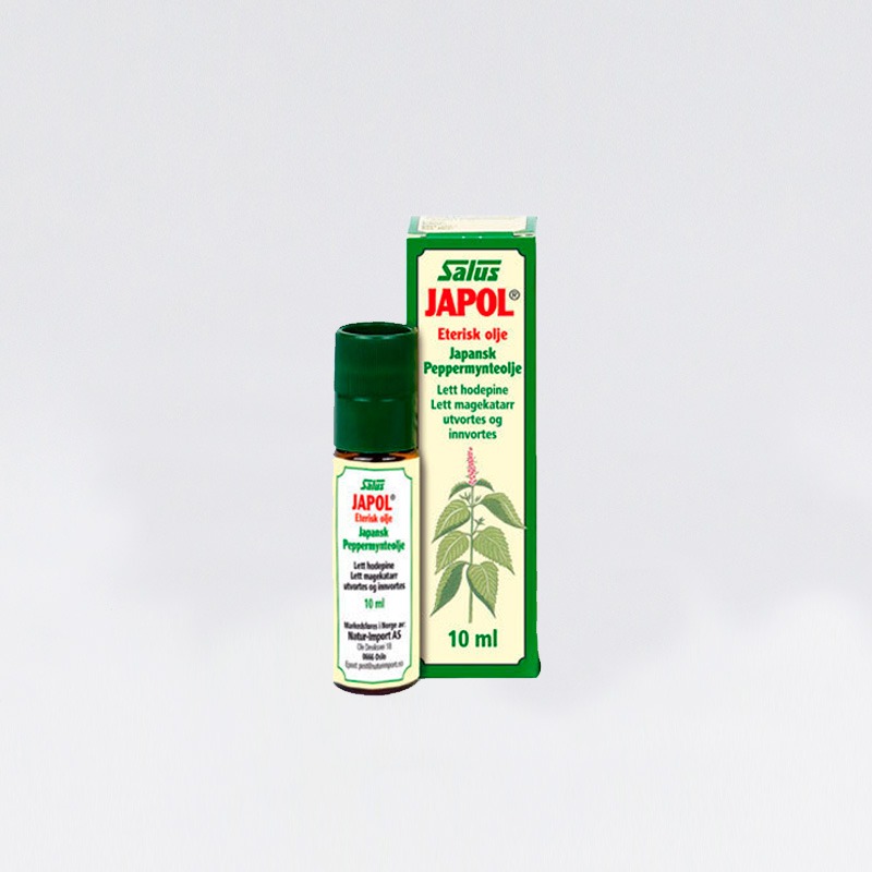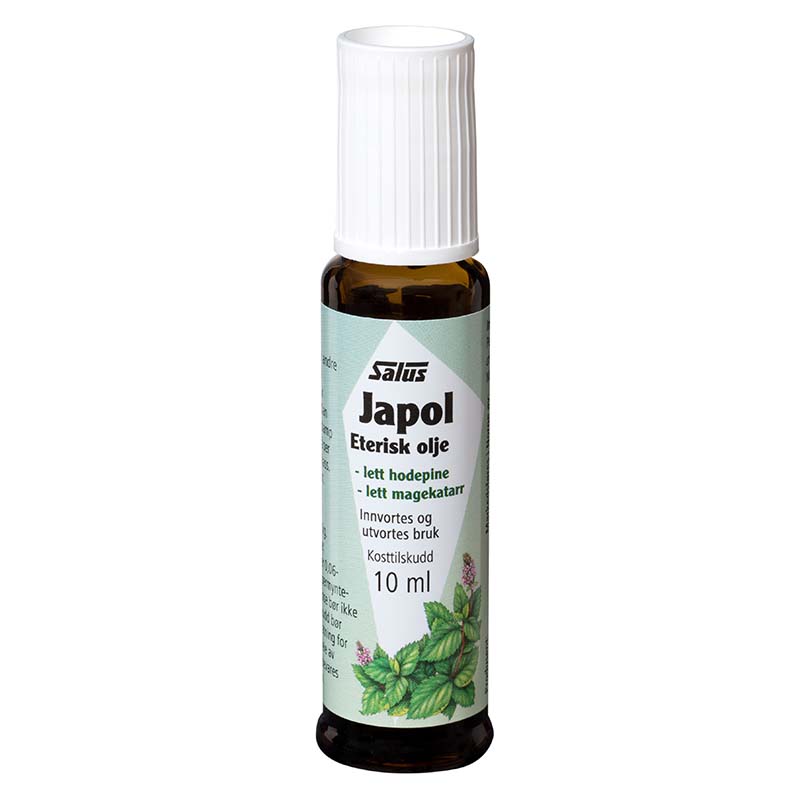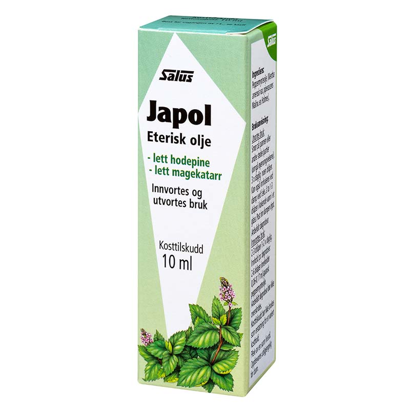 Lett hodepine? Smør peppermynteolje i pannen. Salus peppermynteolje er fremstilt av den japanske peppermyntesorten med høyt innhold av aktive eteriske oljer. Japol (japansk peppermynteolje).